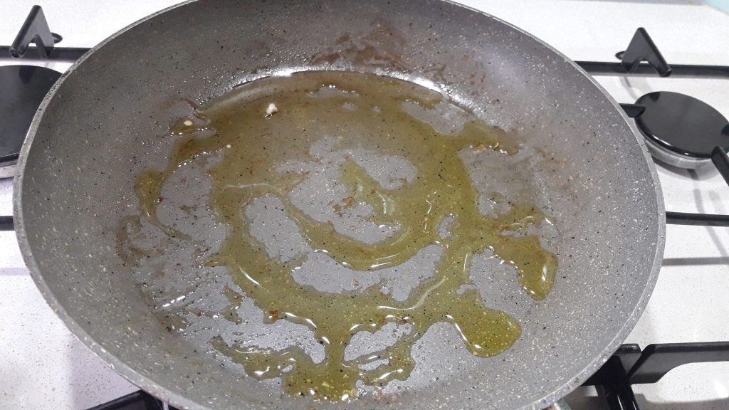 Ponemos un hilo de aceite de oliva virgen extra en una sartén antiadherente a fuego muy alto, y dejamos calentar bien.