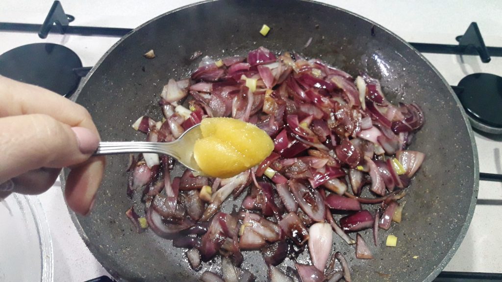 Cuando el vinagre se haya evaporado, es el momento de añadir la miel, mezclando hasta que se disuelva bien.