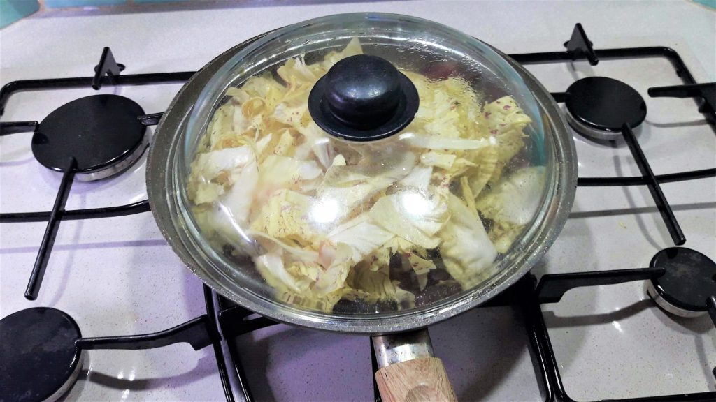 Ha llegado el momento de cocinar la achicoria, pon una pizca de sal encima, mezcla, y…