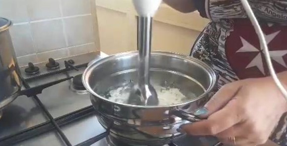 • Incorporé el agua de mejillones o almejas filtrada, llevándola a ebullición mientras removía con un batidor, creé una cremosidad. Luego apagué el fuego y lo mantuve caliente.
