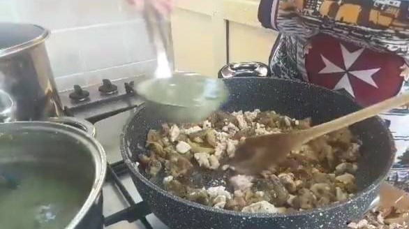 • Ahora completamos el relleno añadiendo los piñones en la sartén con el pez espada y las berenjenas, junto con 2 cucharones de crema de mar.
