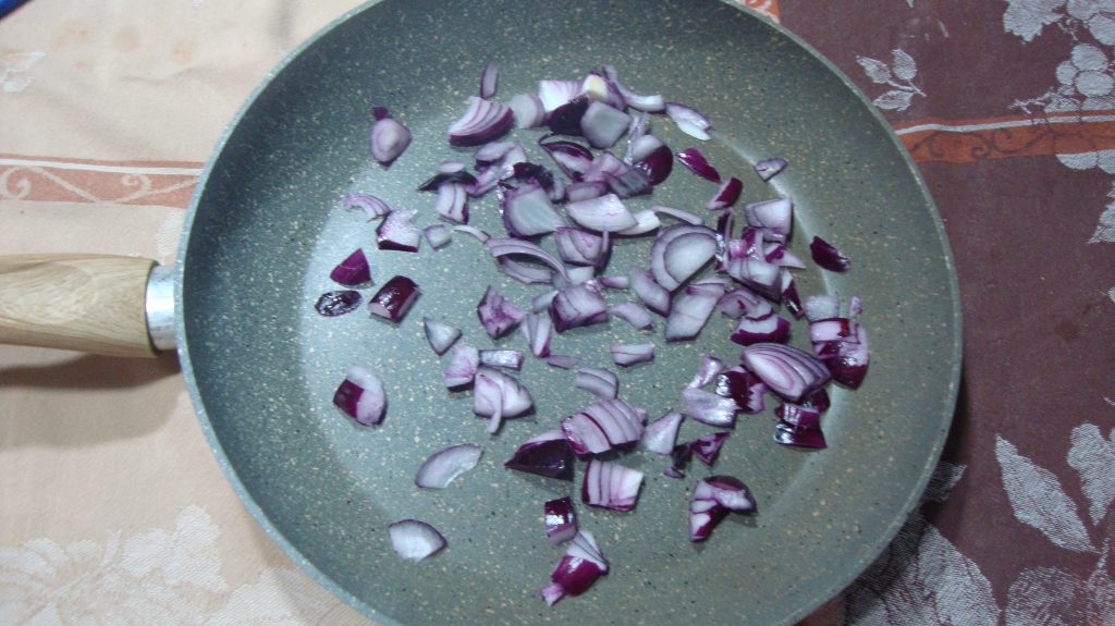 Calabacín Siciliano guisado en sartén. En esta receta los ingredientes se ponen todos juntos simultáneamente en la sartén. Limpiamos y cortamos en trozos bastante grandes la cebolla, y la ponemos en una sartén