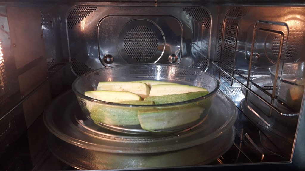 Coloca los calabacines en una fuente apta para microondas y cocínalos en el microondas durante 8 minutos con film transparente por encima.