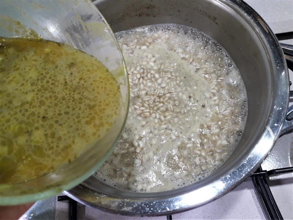 Pon al fuego otra olla con caldo vegetal poco salado, en frío añade la cebada, y cocina 3/4 del tiempo indicado en su paquete.