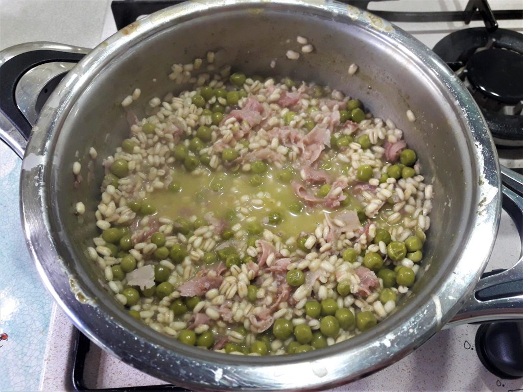 Aquí tienes la cebada perlada con guisantes y jamón.