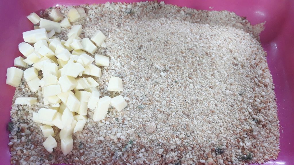 Prepara el pan rallado condimentado a la siciliana, como te he indicado arriba. Corta la provola en cubitos y agrégalos.