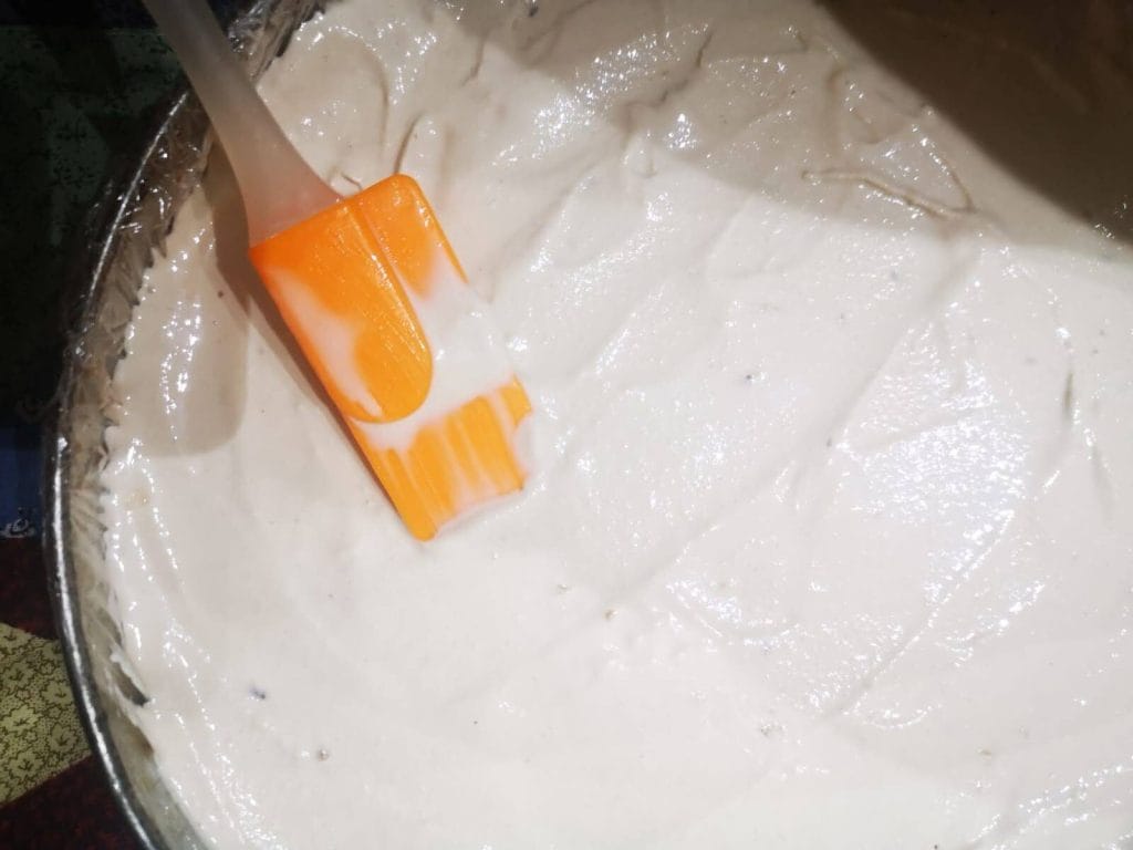 • Mezcla hasta que la mezcla esté uniforme y lisa. Retira la mariposa y saca del frigorífico la base de la cheesecake,