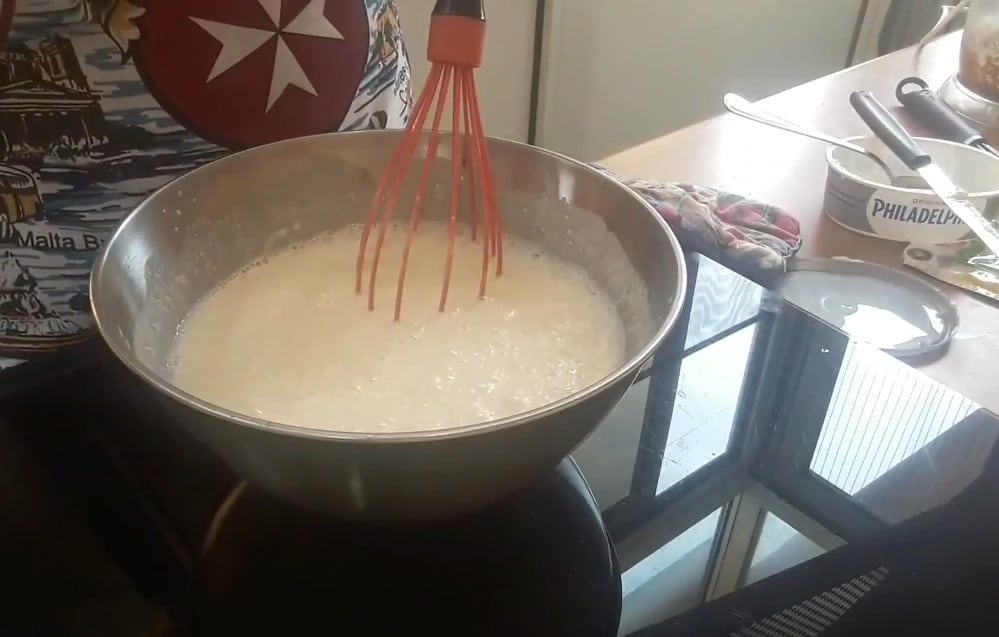 • Incorpora la gelatina disuelta en la crema de ricotta poco a poco y al mismo tiempo mezcla rápidamente con la batidora.