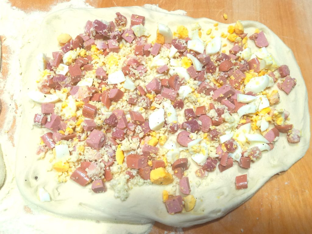 • Esparce por toda la superficie de las dos masas la mezcla de embutidos, huevos y queso
