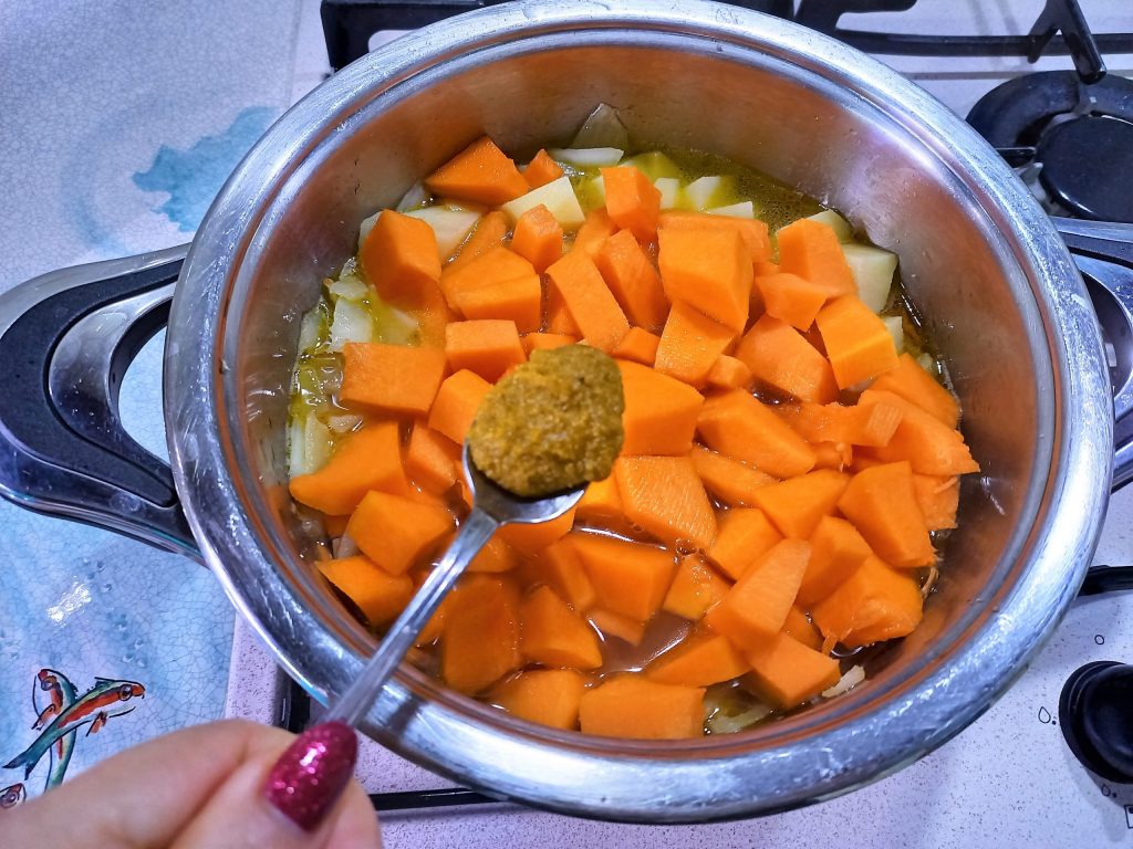Pon en una olla el aceite de oliva virgen extra y la cebolla y deja sazonar por 3 minutos, luego añade la calabaza y las patatas. Mezcla.