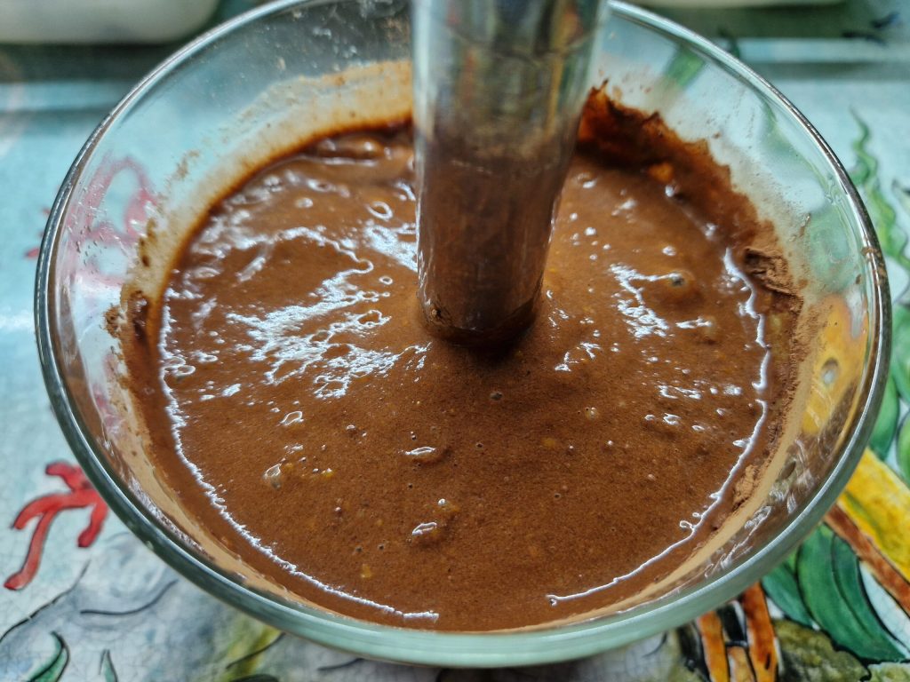 Junto con el cacao amargo, y bate. Si usas la Thermomix, 20 seg vel 8.