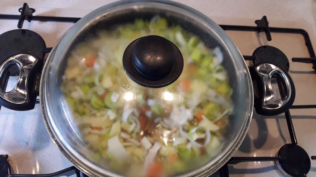 Tapamos y continuamos la cocción hasta que la patata y la zanahoria se hayan ablandado.