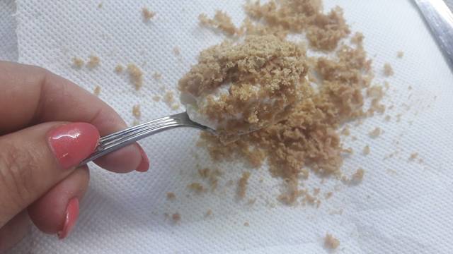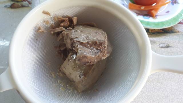 lo he desmenuzado en trozos. Como podéis notar tiene un color diferente al habitual, ya que este atún es pescado y conservado por nosotros en casa.