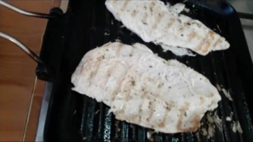Mientras las verduras se enfrían, cocinaremos el pollo en la parrilla de hierro fundido o eléctrica como prefieras, para la parrilla de hierro fundido debemos calentarla bien y luego cocinar las rodajas por ambos lados y después cortar el pollo en tiras.