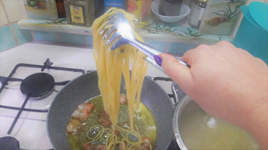 Apenas se haya derretido, pon las gambas crudas, apaga el fuego y espera que los espaguetis estén cocidos a 3/4 de cocción…