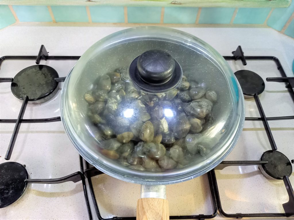 • Mientras las almejas se abren, su líquido está goteando en el agua del vaso, sazonándolo todo.