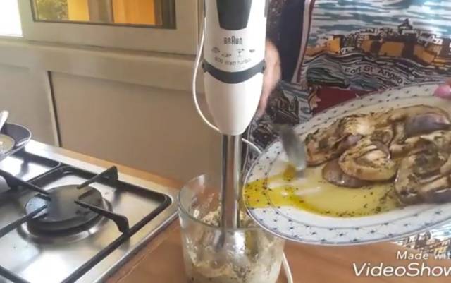 Tritura las berenjenas junto con bastante albahaca y la mozzarella de búfala ahumada, añadiendo un poco de aceite de la marinada. Así habrás preparado la crema que usaremos para el condimento.