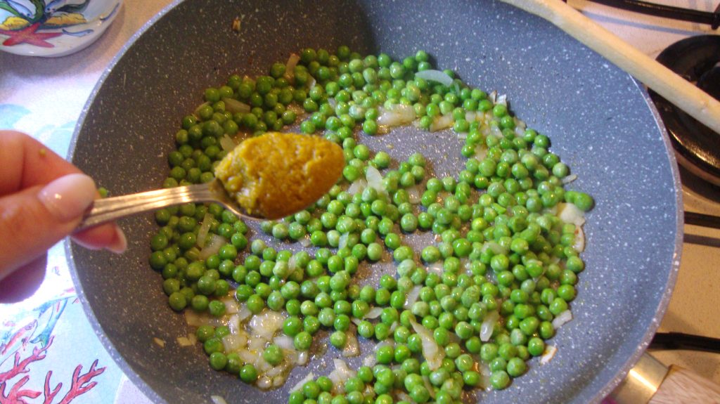 • Luego añade los guisantes, si usas los congelados, déjalos descongelar antes, y mezcla.