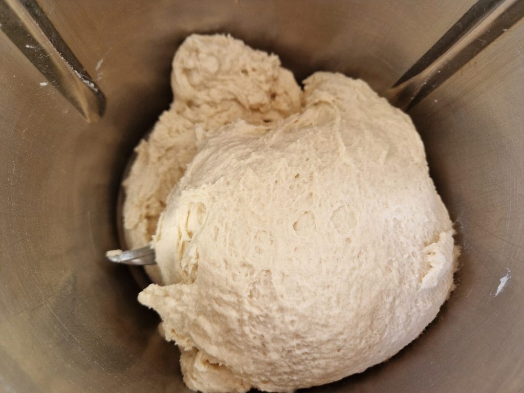 Una vez obtenido este compuesto semilíquido, podéis añadir poco a poco el resto de la harina tamizada previamente con la sal y continuad amasando.