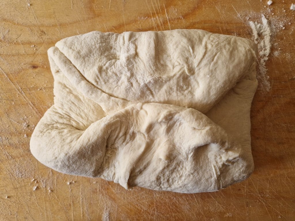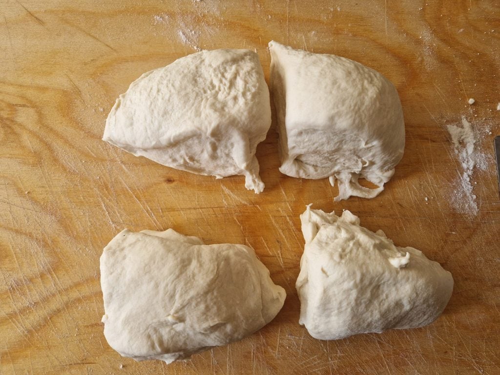 Pasado el tiempo de los pliegues esperad otros 15 minutos y luego dividid la masa en cuatro partes