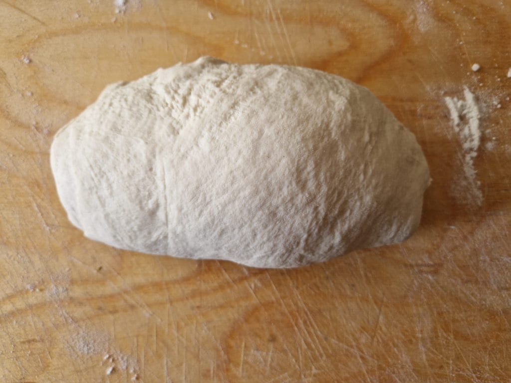 Así que la masa está lista, ponedla sobre una mesa de trabajo enharinada, y compáctadla con las manos hasta formar una bola.