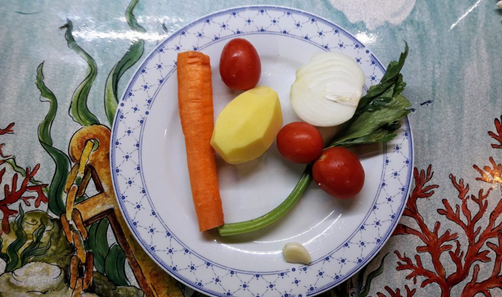 • Llena de agua fría una olla grande y añade todas las legumbres y las verduras cortadas en trozos grandes, y cocina durante al menos 2 horas en una olla normal,