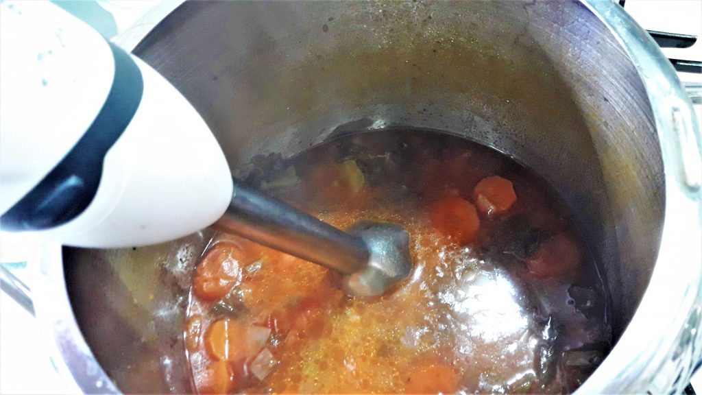 • Sumerge la batidora directamente en la olla y tritura todo el jugo.