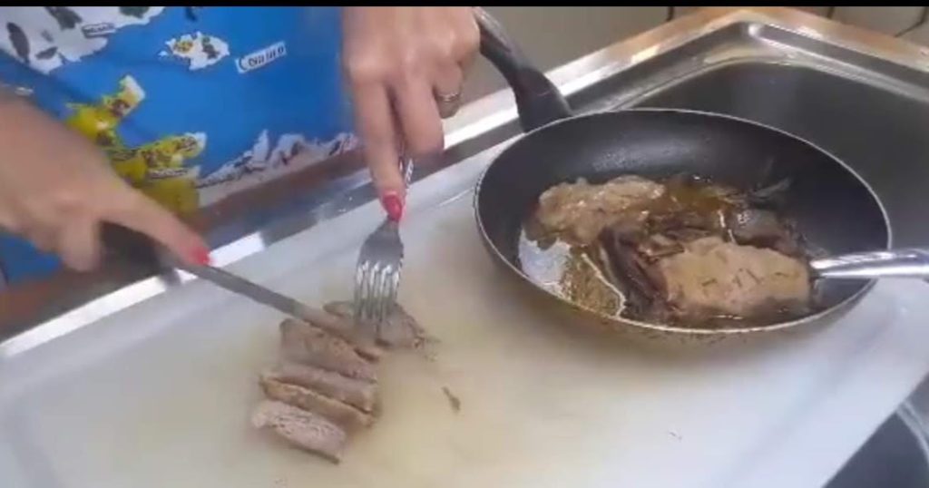 • Cuando la carne esté cocida, colócala sobre la tabla de cortar y córtala en rodajas, es decir, a filetes.
