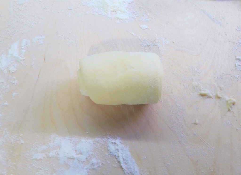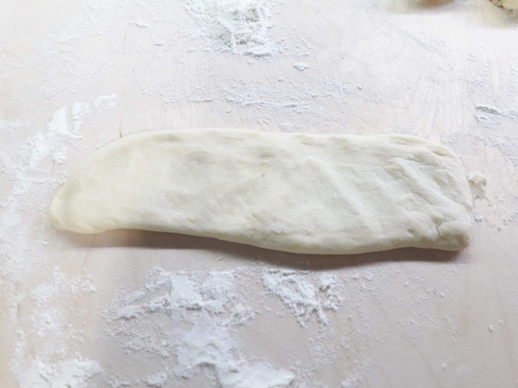 Luego enrolla la masa sobre sí misma desde el lado estrecho.