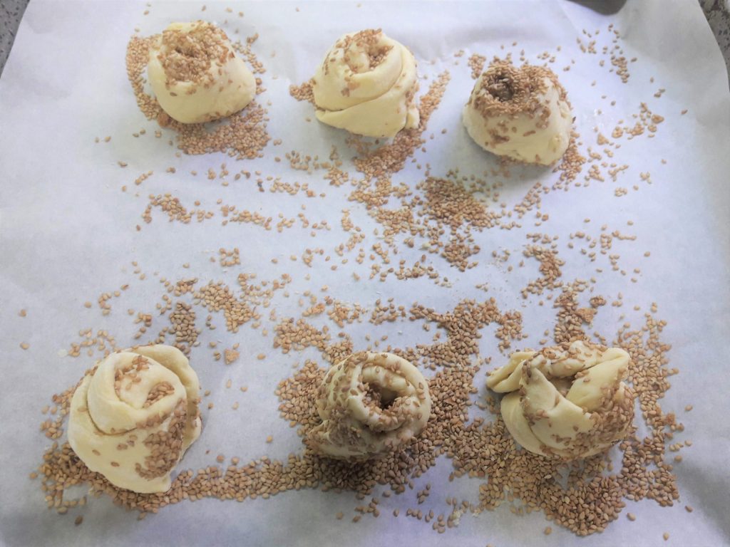 De cada uno haz 2 piezas, luego enróllalas y colócalas de pie en la bandeja del horno con papel de horno.