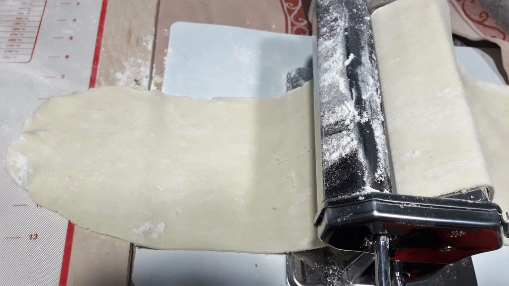 Pasado el tiempo de reposo en el frigorífico, saca la masa blanca, y después de extenderla un poco con el rodillo, pásala por la máquina de pasta, primero con el espesor grueso, y luego con un espesor medio, enharinando donde sea necesario.