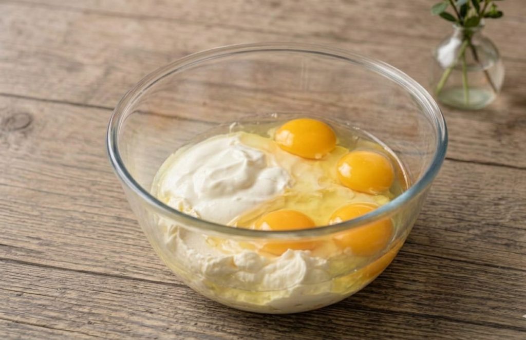 Añadimos la nata agria/yogur griego y los huevos, y batimos.