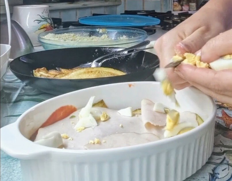• Luego una capa de jamón, una de huevos duros, de mozzarella y..