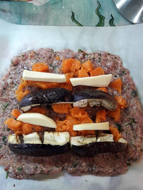 Después de haber extendido la mezcla, coloca las verduras encima y el galbanino. Seguro te quedarán verduras. Bien, resérvalas porque las necesitarás después.