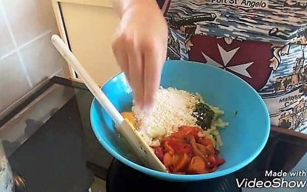 • Luego transfiérelo a un bol y añade: las alcaparras desaladas previamente, el aceite de oliva virgen extra, los trozos de pimientos que estaban un poco feos triturados, la leche, los huevos, las almendras trituradas, sal y pimienta, y bate la mezcla