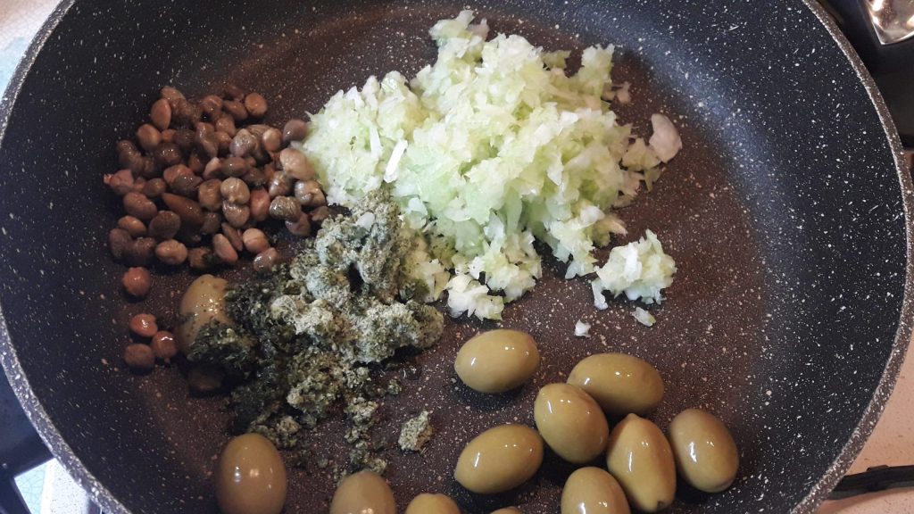 Cuando hayas dorado todos los filetes, en la misma sartén añade el otro aceite, las alcaparras desaladas, las aceitunas, el apio cortado en trozos pequeños y la cebolla picada, y sofríe durante unos 3 minutos.