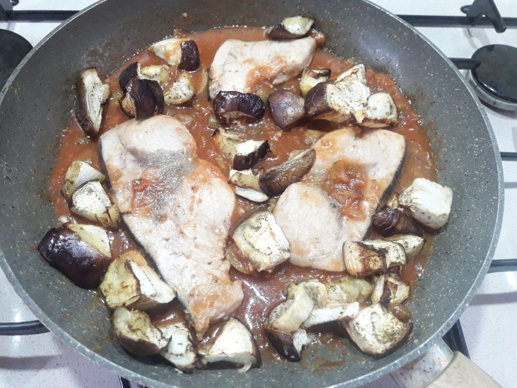 Aquí está listo el Pez espada y berenjenas a la sartén.