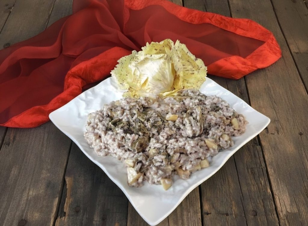 Mezcla, ajusta de sal y pimienta y sirve. El risotto con radicchio Maserà y manzanas está servido.