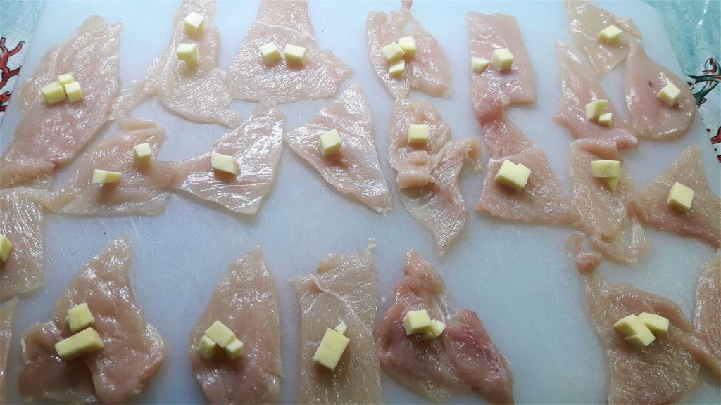Extiende las lonchas de pechuga de pollo sobre una tabla de cortar, y coloca encima uno o más cubos de queso.