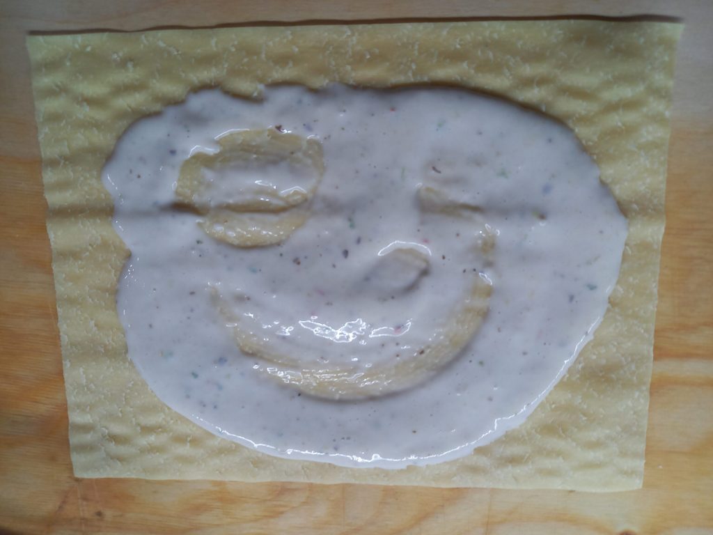 Toma una lámina de pasta al huevo de unos 20 cm de alto y 30 de ancho, es decir un rectángulo; colócala sobre la superficie de trabajo, reparte sobre ella las distintas capas de relleno, empezando por una cucharada de bechamel,