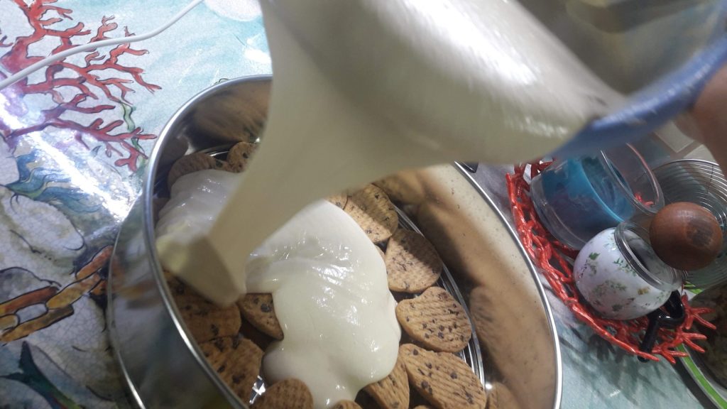 Ahora ha llegado el momento de verter la mezcla en el molde sobre las galletas.