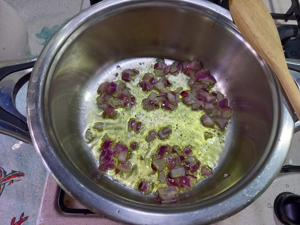 • En una olla, añade el aceite de oliva y la cebolla y deja sofreír durante 3 minutos