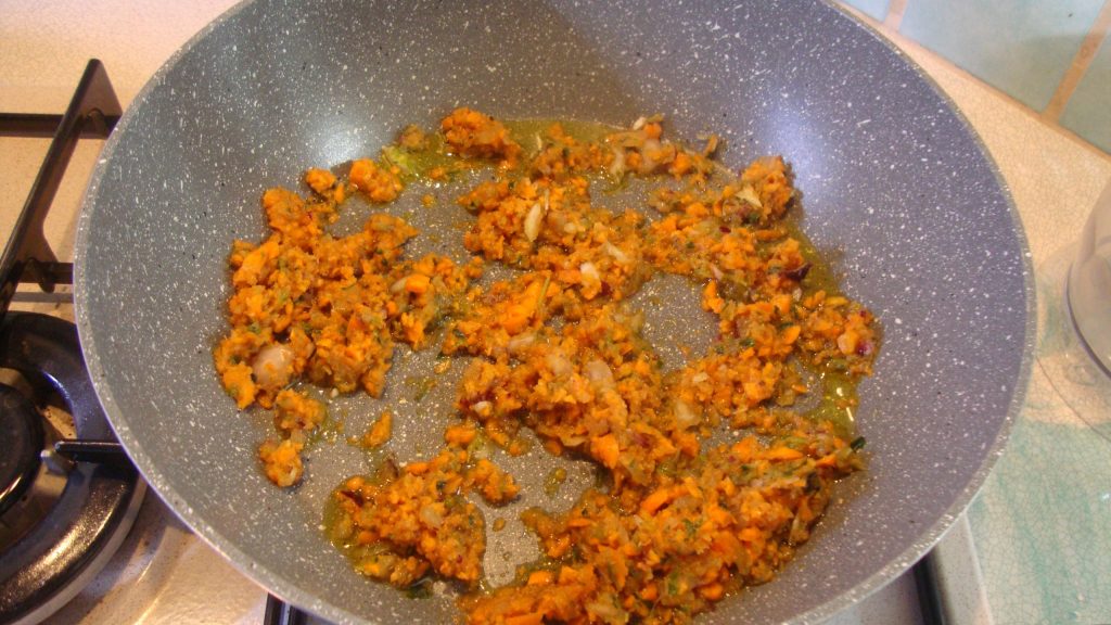 • Pela la cebolla, la zanahoria y el apio, córtalos en trozos y colócalos en una olla o sartén, agrega el aceite de oliva virgen extra y deja sofreír durante 2 minutos,