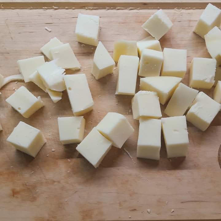 • Corta el caciocavallo o la provola en trozos de aproximadamente 1 cm.