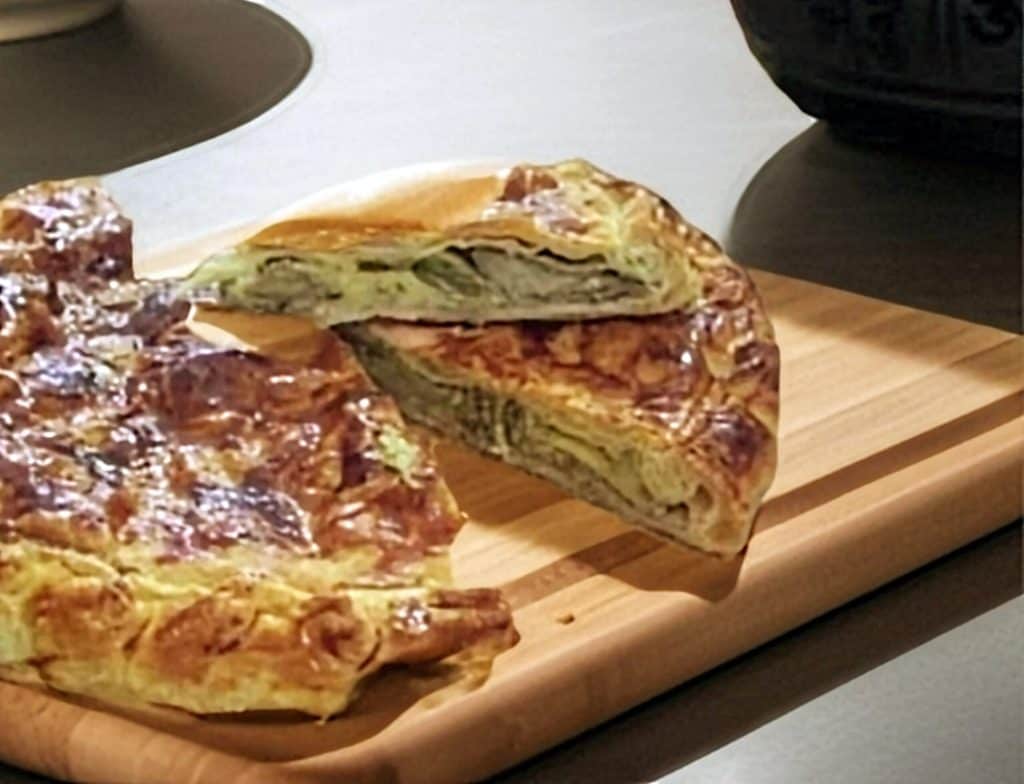 Tarta salada de hojaldre con alcachofas.