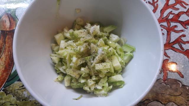 • Del resto de los calabacines hacemos una dadolata y la dividimos en 2 partes. Una la condimentamos con sal, pimienta y aceite de oliva virgen extra.