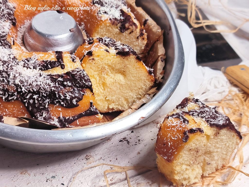 • para hacer el bizcocho, puedes seguir el procedimiento de esta receta. Vierte en un molde de bizcocho de unos 24 cm cubierto con un papel para freidora de aire e introduce en el horno, a 180 grados, durante unos 35 minutos pero ajústate siempre con tu horno y haz la prueba del palillo. Sácala del horno y déjala enfriar. Mientras tanto, pon un poco de agua en un bol pequeño y añade poco a poco el cacao, mezcla hasta obtener una consistencia bastante densa. Vierte este glaseado sobre el bizcocho y espolvorea de inmediato con el coco rallado. Sentirás qué delicia
