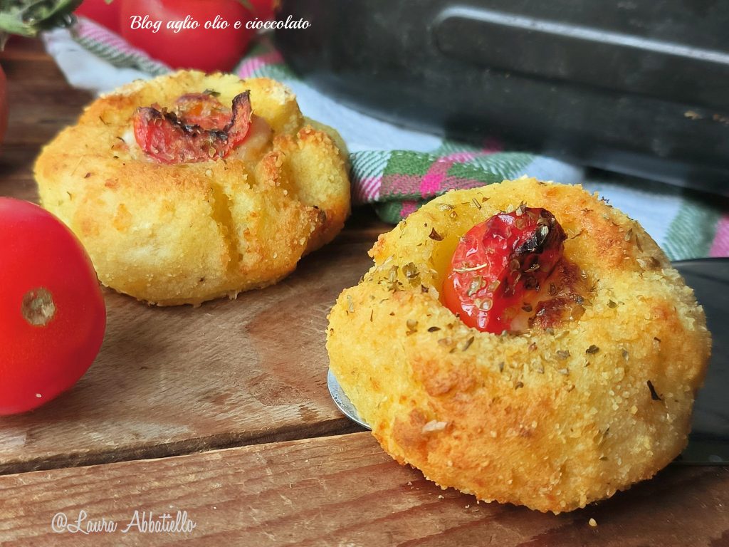 Se trata de una masa hecha solo con patatas luego sazonada al gusto según tus preferencias y no están fritas aunque parecen fritas porque están cocidas en freidora de aire. Como relleno he escogido la mozzarella que las hace fundentes y el tomate, pero puedes elegir el relleno que más te guste. Solo tienes que amasar las patatas con la harina y sazonarlas como más te guste y luego las rellenas y las cocinas y en pocos minutos disfrutarás de unas delicias que enloquecen a todos, grandes y pequeños.