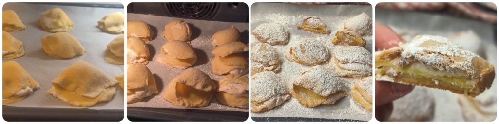 Cocción de las galletas: Coloca las galletas en una bandeja de horno cubierta con papel de horno y hornea a 180 grados durante unos 20 minutos, pero ajusta según tu horno y cuando estén bien crujientes e hinchadas, sácalas del horno y espolvorea con azúcar glas.