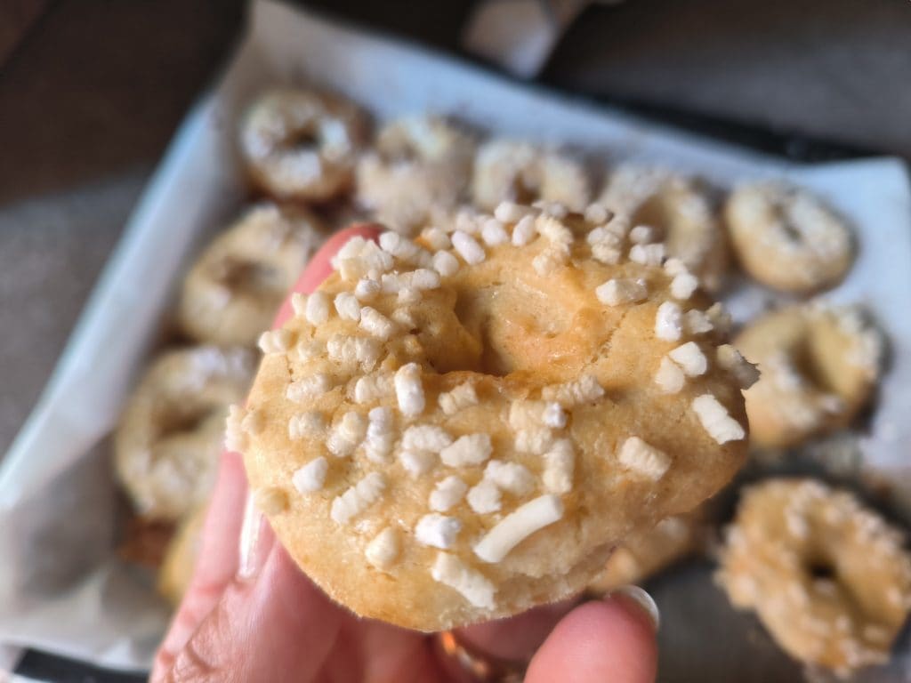 FORMA Y HORNEA LAS ROSQUILLAS: Después del reposo, empieza a formar las rosquillas. Puedes hacerlo de dos maneras: o separas trozos, formas cilindros y luego los unes dando forma a las rosquillas o, como hice yo, separas trozos, decides el tamaño, haces una bolita y luego perforas en el centro hasta el fondo formando la rosquilla de esta manera tendrás rosquillas más gorditas. Colócalas en una bandeja forrada con papel de horno, pincela las rosquillas con leche y espolvorea con azúcar en granillo y hornea a 180 grados durante unos 10 minutos pero ajústate a tu horno. Una vez cocidas, si quieres, puedes espolvorearlas con azúcar glas.